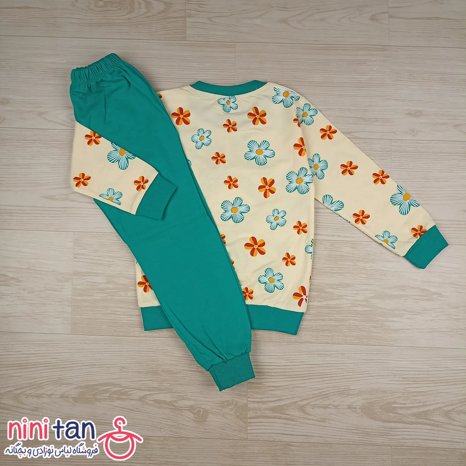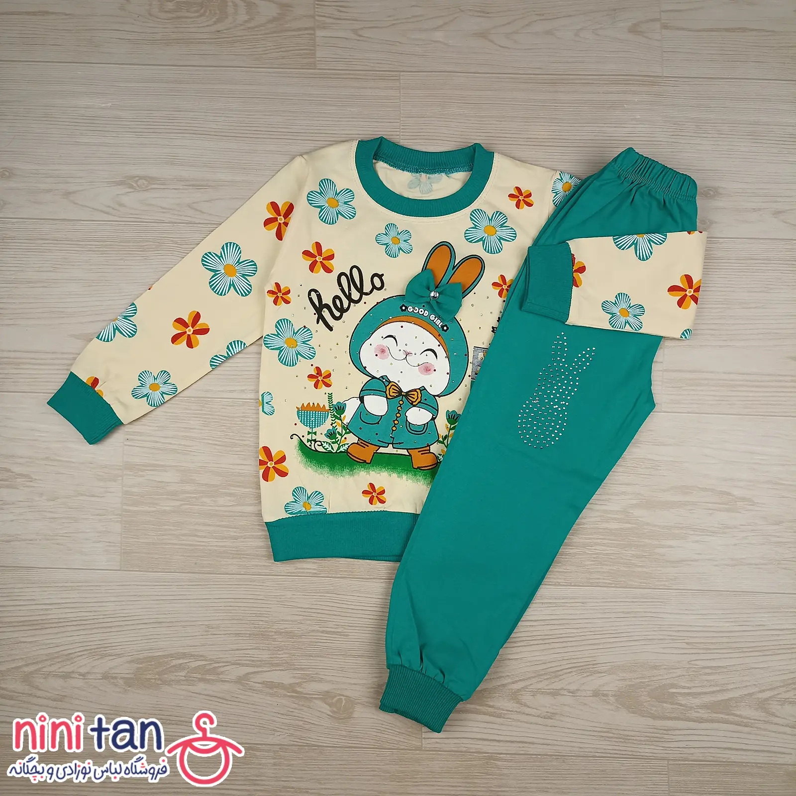 بلوز شلوار بچگانه دخترانه طرح خرگوش و پاپیون سایز ۳۵ تا ۵۰ – سبز آبی